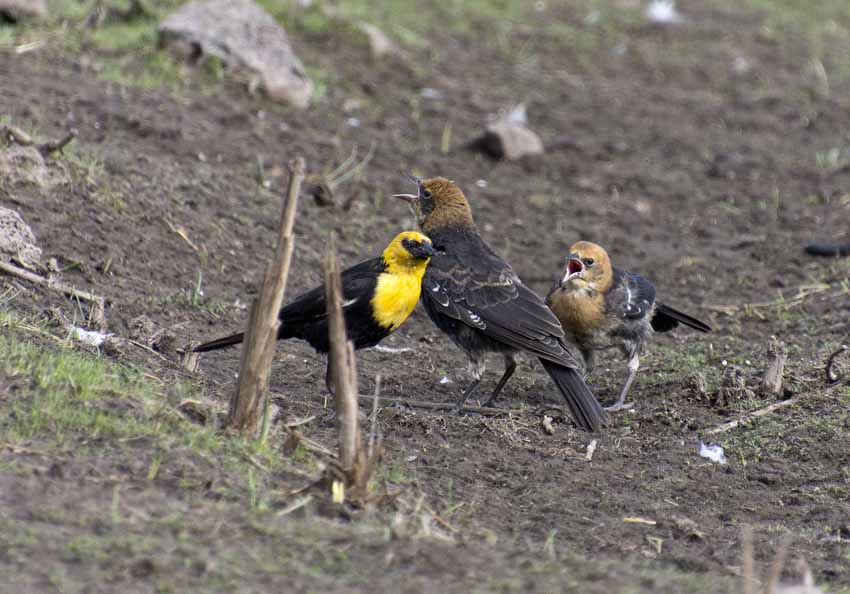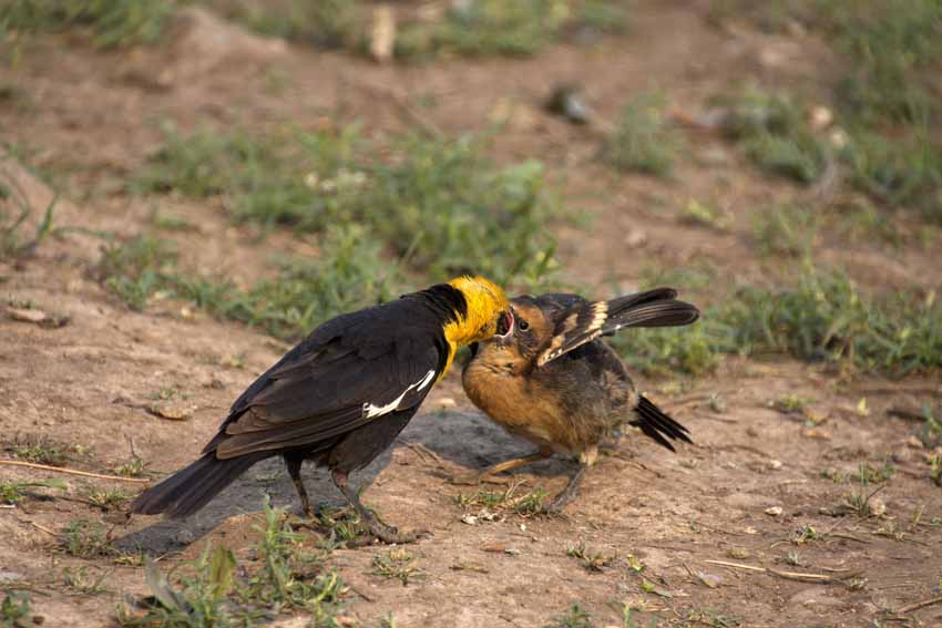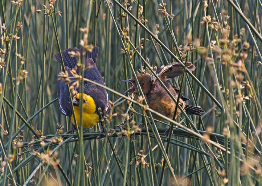 | Yellow headed blackbird feeding cowbird chick. Cowbirds lay their eggs in other birds nest and so are parasitic. |